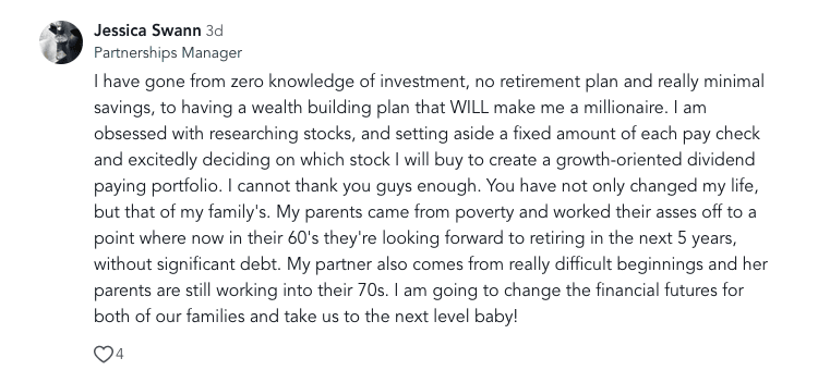 We’ll stick with you until you’re 100% confident in your ability to invest. We will hold you accountable and be there to answer any and all questions.
